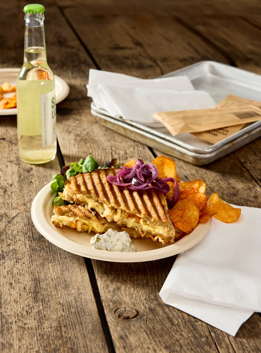 Grillad dubbelmacka på surdegsbröd från Gamla Bageriet, maxad med vår egen kimchi och smält krämig ost , stekt gyllene i smör från Thise. Doppa i vår egna fermenterade chilimajo eller syrad ramslöksmajo. Serveras med en näve hantverkschips och toppad med gröna blad. Allt är ekologiskt.